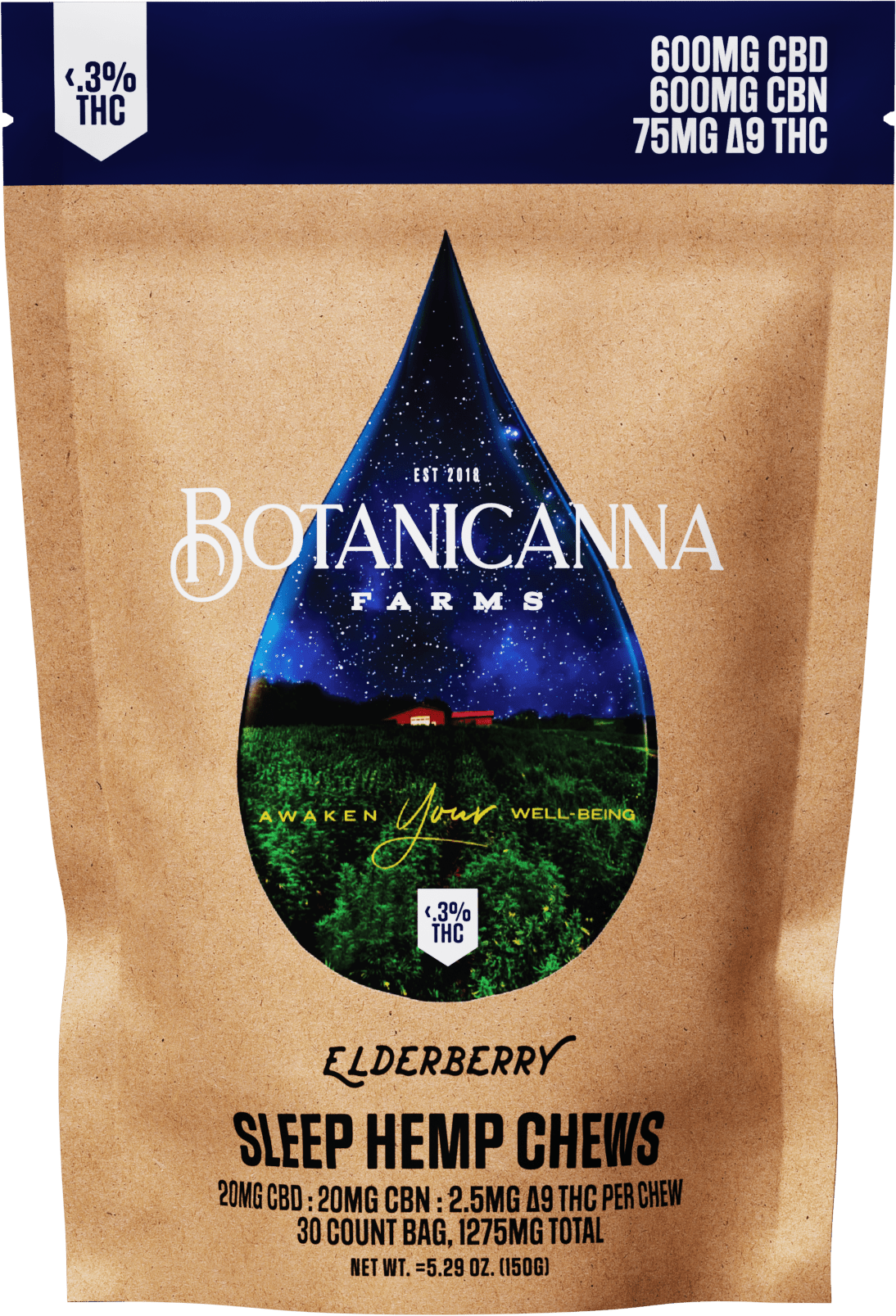 2.5mg D9 THC. 20mg CBD. 20mg CBN. 30 Hemp Chews per bag.