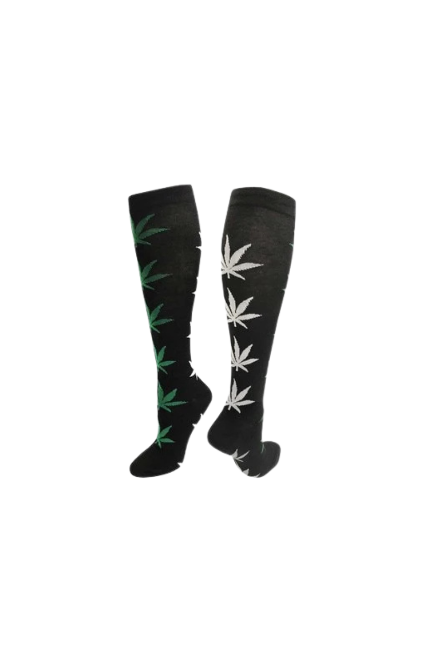 Julietta Fashion Knee High Socks Black w/ Green/White Cannabis Leaves