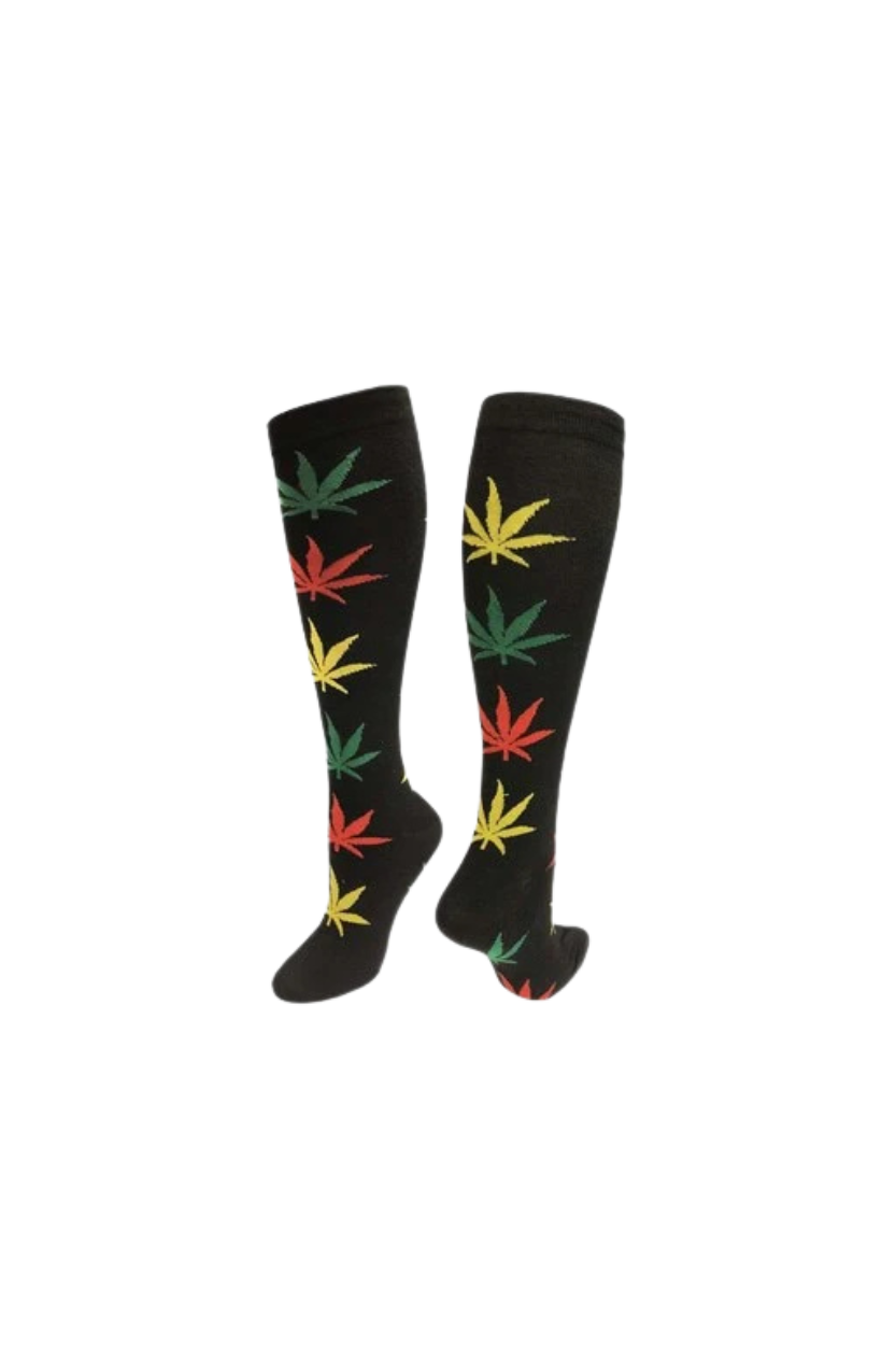 Julietta Fashion Knee High Socks Black w/ Rasta Cannabis Leaves