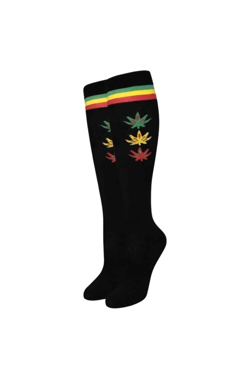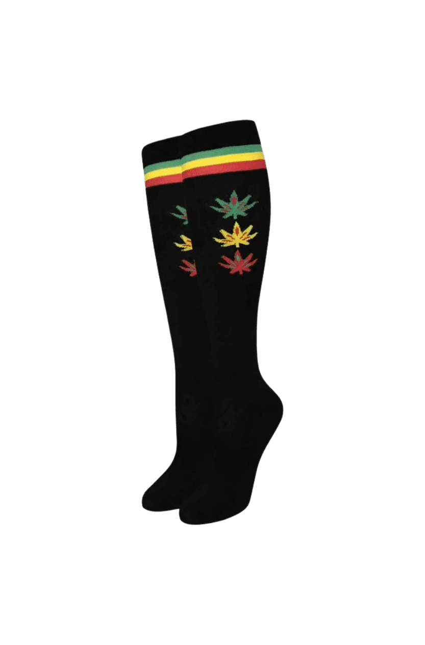 Julietta Fashion Over The Knee High Socks Black w/ Rasta Cannabis Leaves